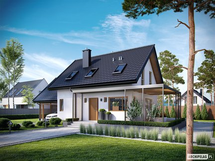 Niewielki, ale komfortowy i przytulny dom z poddaszem użytkowym o klasycznej bryle z dachem dwuspadowym. Wnętrze jest funkcjonalnie rozplanowane i znakomicie doświetlone, zapewniając domownikom komfort i pełną swobodę. Na szczególną uwagę zasługuje obszerny taras okalający dom z dwóch stron, częściowo zadaszony atrakcyjną pergolą – idealne miejsce na wypoczynek.