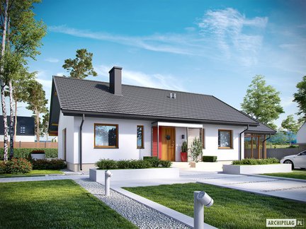 Hit naszej kolekcji. Ten parterowy dom o prostej konstrukcji jest tani w budowie i późniejszej eksploatacji, nie wymaga również bardzo dużej działki. Prosta forma została wzbogacona pergolą przy wejściu do domu oraz ciekawym zadaszeniem nad tarasem. Wnętrze funkcjonalnie rozplanowane z czytelnym podziałem na strefy gwarantuje mieszkańcom maximum wygody. Do budynku przylega zadaszona, ażurowa wiata garażowa.