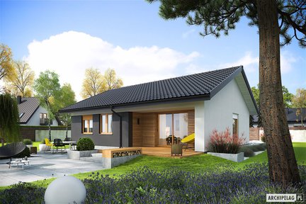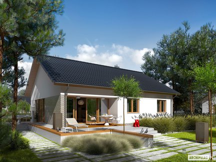 To niewielki dom, który idealnie wpasuje się na małą działkę. Ma wyraźny podział na strefy użytkowe i maksymalnie wykorzystaną powierzchnię. Z pozoru niewielki i skromny, w środku zaskakuje swoją funkcjonalnością i świetnie zorganizowanym wnętrzem. Dopełnieniem części wypoczynkowej domu jest zadaszony taras. Pełen komfort w parze z oszczędnością.