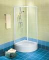 Najnowszy model kabiny półokrągłej wykonany jest z profili aluminowych i giętego hartowanego szkła ze wzorem w kropki. Posiada jedne przesuwane drzwi które w zależności od układu łazienki mogą być zamontowane z wejściem z prawej lub lewej strony. Drzwi przesuwają się bardzo lekko i cicho zawieszone są na łożyskowanych kółeczkach. Kółka osadzone na mimośrodzie umożliwiają precyzyjne wypoziomowanie drzwi. Jednoelementowe profile kabiny gwarantują stabilność jej konstrukcji.