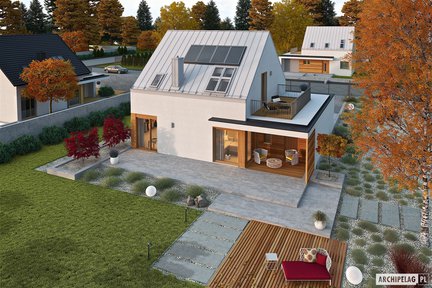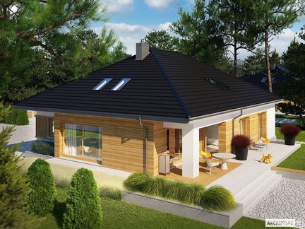 Piękna bryła ocieplona drewnem na elewacji. Wyjątkowo funkcjonalny projekt domu dla 3-4 osobowej rodziny, z przestronnym salonem i obszerną kuchnią połączoną ze spiżarnią. Wygodne wnętrze można jeszcze powiększyć wykorzystując powierzchnię poddasza. Dużym atutem domu są przeszklenia zapewniające mnóstwo naturalnego światła, a także zaciszny, zadaszony taras będący przedłużeniem strefy dziennej.
