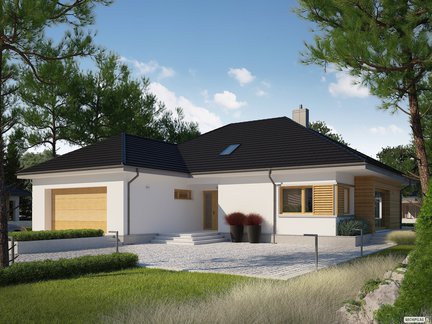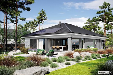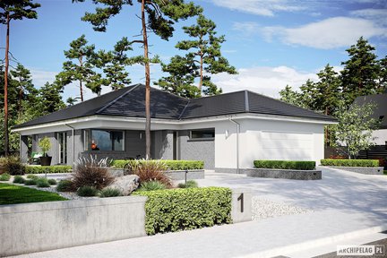 Piękny dom parterowy z eleganckim wykończeniem elewacji – biały tynk połączono z okładziną klinkierową w modnym szarym odcieniu. Bardzo przestronne wnętrze zostało funkcjonalnie rozplanowane z wyraźnym podziałem na strefy. Wygodne sypialnie, w tym jedna z własną łazienką i garderobą, mają bezpośredni dostęp do ogrodu. Otwarta część dzienna jest pięknie przeszklona, dzięki czemu zieleń kwiatów i roślin swobodnie przenika do środka, pozytywnie wpływając na dobre samopoczucie domowników. Dopełnieniem całości jest zadaszony taras.