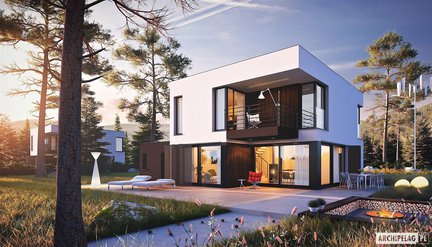 Nowoczesny dom kostka – piętrowy z płaskim dachem, zachwyca zarówno swoim wyglądem zewnętrznym, jak i funkcjonalnie rozplanowaną przestrzenią w środku. 125 m2 pozbawione skosów można w pełni wykorzystać na cele mieszkalne. Dużym plusem projektu są szerokie przeszklenia, które otwierają wnętrze na ogród. Taras okalający dom i uroczy balkon na piętrze to dodatkowe atuty, dzięki którym codzienne użytkowanie domu jest niezwykle wygodne i przyjemne.