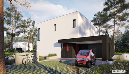 Prosta, klasyczna bryła tego domu przyciąga uwagę elegancką elewacją – ponadczasowa biel z dodatkiem ciepłego drewna harmonijnie wpisze się w otoczenie każdej działki. Nowoczesny charakter budynku podkreśla dodatkowo dwuspadowy dach bez okapu. Ten niewielki dom jest przytulny i wygodny dzięki funkcjonalnie zaprojektowanemu wnętrzu. Wyraźny podział na strefy zapewnia komfort mieszkańcom. Atutem projektu są także dwa tarasy: jeden zadaszony obok salonu, a drugi na dachu garażu, do którego mamy dostęp z sypialni – wspaniałe warunki do odpoczynku na świeżym powietrzu.