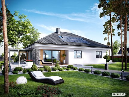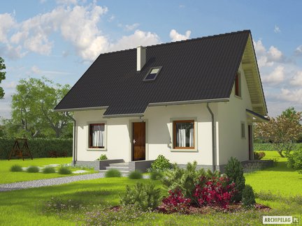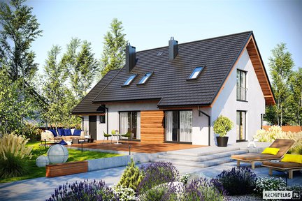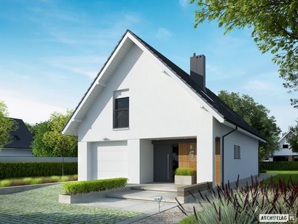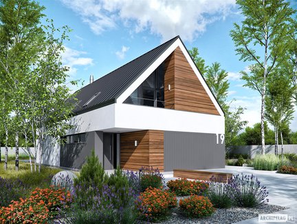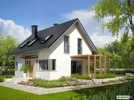 Ten projekt domu to propozycja dla miłośników eleganckiej prostoty. Ekonomiczny w budowie, o prostej bryle z dwuspadowym dachem – tani, ciepły i bardzo przytulny. Uwagę przyciągają ciekawe zadaszenia, które podkreślają nowoczesny charakter budynku. Wnętrze zapewnia maksimum wygody i komfortu domownikom, oferując trzy sypialnie na poddaszu oraz dodatkowy gabinet na parterze. Otwarta strefa dzienna powiększona o przylegający taras integruje rodzinę i pozwala wspólnie spędzać czas.