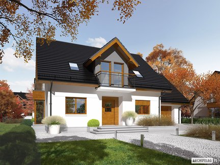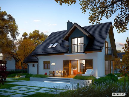 Ten projekt domu to doskonałe połączenie tradycyjnej architektury z nowoczesnym wykończeniem. Prostą bryłę budynku urozmaicają lukarny od frontu i ogrodu oraz oszklony wykusz, w którym umiejscowiono jadalnię. Wnętrze jest funkcjonalnie rozplanowane i wspaniale doświetlone. Powierzchnia została maksymalnie wykorzystana – na parterze znajduje się dodatkowy gabinet, natomiast przestrzeń nad garażem można przeznaczyć na strych. Dodatkowym atutem jest zaciszny balkon dostępny z sypialni głównej na poddaszu.