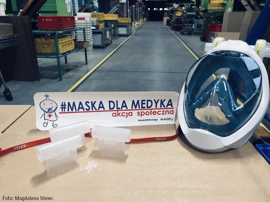 Grupa VELUX podjęła się bezprecedensowej współpracy z organizatorami akcji #MaskaDlaMedyka oraz firmami 3D LAB, YASA Motors Poland, Andrychowska Fabryka Maszyn Defum s.a. Dzięki zaangażowaniu wielu osób udało się w rekordowym tempie zaprojektować i uruchomić masową produkcję adapterów metodą wtryskową. Grupa Techniczno-Projektowa #MaskaDlaMedyka, złożona z praktyków i pracowników wiodących uczelni technicznych w Polsce, opracowała projekt i prototyp adaptera. Zespół 3D Lab odpowiadał za wyszukanie i dobór partnerów posiadających niezbędne zasoby technologiczne, zaś Yasa Motors Poland wzięło na siebie wykonanie projektu formy wtryskowej i wyprodukowanie jej newralgicznych części. Andrychowska Fabryka Maszyn Defum s.a. przygotowała pozostałe elementy potrzebne do złożenia kompletnej formy wtryskowej. Gnieźnieńska fabryka VELUX podęła się masowej produkcji adaptera wykonanego z plastiku. Wielka Orkiestra Świątecznej Pomocy sfinansowała zakup 10 000 masek, które zostały ekspresowo wyprodukowane przez Decathlon w Polsce i jeszcze w tym tygodniu zostaną przekazane do placówek medycznych w całej Polsce.