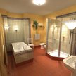 W łazience: produkty dostępne w sieci Raab Karcher - wanna Ideal Stand z serii Esprit; wc bidet i umywalki Duravit 1930series kabina i brodzik Huppe 1002 5-ciokąt armatura i wyposażenie Hansgrohe Axor Carlton.