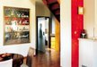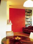 W mocnym kolorze krwistej czerwieni dodatkowo pokryta włoskim stiukiem. Barwa tej ściany narzuciła kolorystykę całemu wnętrzu i zdominowała jego wystrój. Do niej dobrano czerwoną sofę ulubiony mebel gospodarza. Dobrze komponują się z nią drewniane żaluzje w oknach i podłoga. Pozostałe sprzęty - kanapy w części wypoczynkowej fotel stolik i szafki - utrzymane są w tonacji beżu i ciemnego brązu.