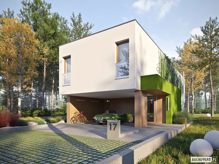 To idealny projekt domu dla miłośników nowoczesnej architektury – szczególnie polecany na wąską działkę. Prosta forma z płaskim dachem prezentuje się ciekawie i niebanalnie. Przestronne i wygodne wnętrze jest wspaniale doświetlone. Szerokie przeszklenia w strefie dziennej, jak również w sypialni na piętrze zapewniają piękny widok na ogród. Atutem projektu są również przytulny taras i balkon . Całość dopełnia obszerna wiata garażowa zaprojektowana w bryle budynku.