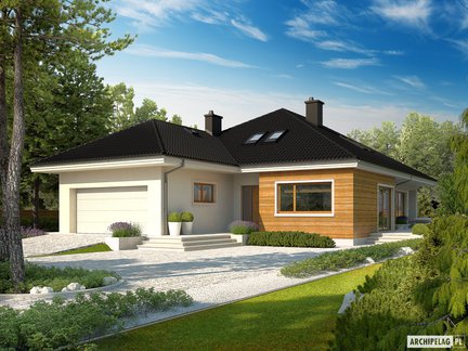 Projekt domu parterowego o wyjątkowej, nowoczesnej architekturze. Zróżnicowane zadaszenie (nad częścią mieszkalną dach dwuspadowy, nad garażem płaski) zaznaczyło podział funkcji budynku i nadało mu oryginalny charakter. Dodatkowo przedłużony dach garażu stanowi zadaszenie tarasu, dzięki temu zyskujemy dodatkową przestrzeń do odpoczynku nawet przy gorszej pogodzie. Dużym atutem projektu jest reprezentacyjny salon, którego szerokie przeszklenia sprawiają, że otaczająca zieleń przenika do wnętrza.