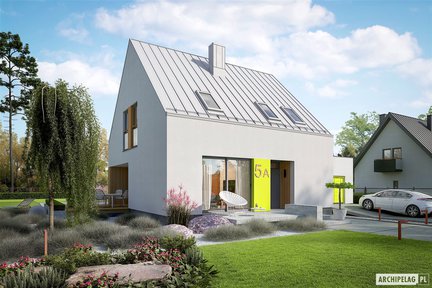 Ten mały i tani w budowie dom charakteryzuje się prostą, kompaktowa formą, odpowiednim rozmieszczeniem okien oraz wygodnym układem pomieszczeń. Jest idealną propozycją zarówno dla młodego małżeństwa, singla, jak i pary seniorów. Do dyspozycji domowników jest także zadaszony taras oferujący przyjemne warunki do odpoczynku z relaksującym widokiem na ogród.