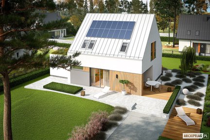 To energooszczędny, ciepły i tani w utrzymaniu dom wyposażony w pompę ciepła, wentylację mechaniczną z rekuperacją i ogniwa fotowoltaiczne. Eleganckie i nowoczesne wykończenie elewacji idzie w parze z niezwykłą funkcjonalnością. Dużym plusem projektu jest znakomite doświetlenie wszystkich pomieszczeń, a także pełna harmonia wnętrza i ogrodu.
