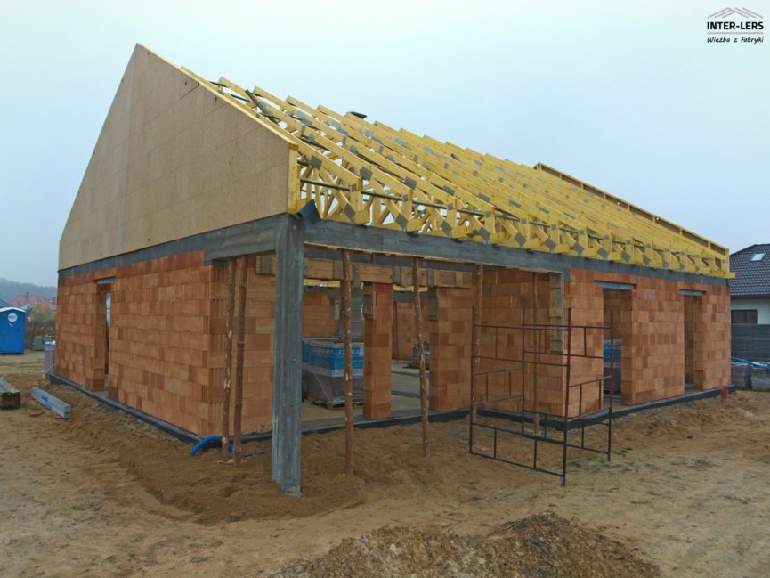 Poniżej prezentujemy galerię zdjęć z budowy domu wg. projektu Ralf G1. W ciągu dwóch dni firma Inter-Lers kompleksowo wykonała konstrukcję ścian szczytowych oraz dachu, w której pas dolny pełni rolę stropu, a na górze znajduje się obszerny i wygodny stryszek. Tak przygotowany budynek mógł od razu zostać przekazany firmie dekarskiej.
