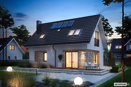 Projekt domu tani w realizacji, ekonomiczny w utrzymaniu i bardzo wygodny na co dzień, którego prosta bryła została wzbogacona lukarną nad wejściem. Prezentuje się bardzo efektownie dzięki eleganckiej elewacji wzbogaconej okładzina kamienną. Wspaniale doświetlone wnętrze posiada funkcjonalny rozkład pomieszczeń, z maksymalnym wykorzystaniem powierzchni.