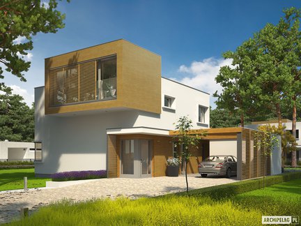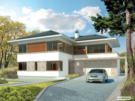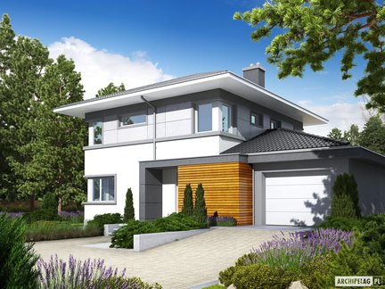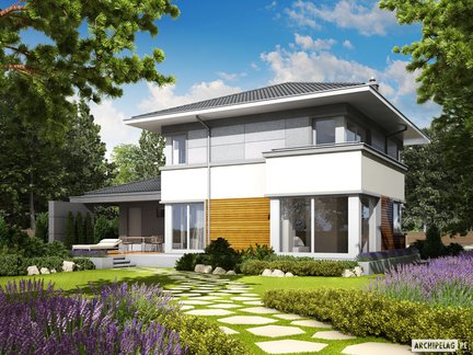 To projekt domu, który spełni oczekiwania wszystkich inwestorów poszukujących nowoczesnych rozwiązań. Modnie wykończona elewacja oraz zastosowanie ciekawych detali sprawia, że budynek wygląda elegancko i nieszablonowo. Wnętrze jest przestronne i funkcjonalnie rozplanowane z wyraźnym podziałem na strefy między kondygnacjami. Szerokie przeszklenia i narożne okna zapewniają wspaniałe doświetlenie pomieszczeń. Na uwagę zasługuje również atrakcyjny, częściowo zadaszony taras.