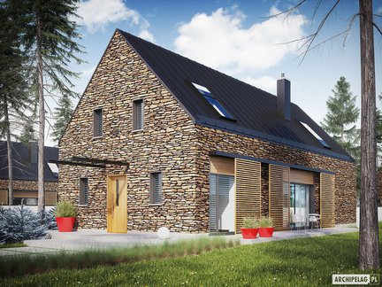 To klasyczny przykład projektu domu-stodoły. Budynek zachwyca wyjątkowym wykończeniem elewacji – połączenie okładziny kamiennej i drewna nadaje mu nowoczesnego charakteru i pięknie harmonizuje z otaczającą naturą. Wygodne i funkcjonalne wnętrze zostało wspaniale doświetlone szerokimi przeszkleniami. Na szczególna uwagę zasługuje całkowicie przeszklona ściana salonu, która otwiera wnętrze na ogród.