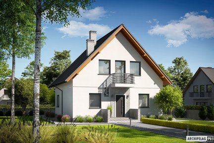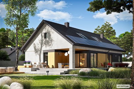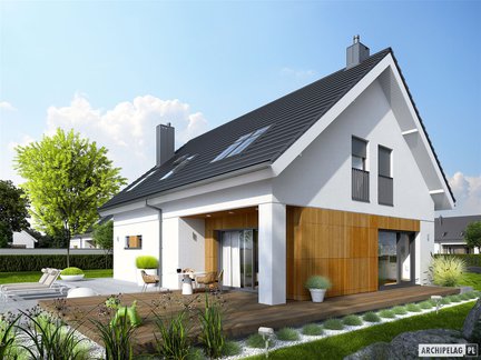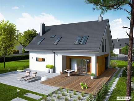 Ten projekt domu spełni wszystkie oczekiwania współczesnej rodziny – jest tani i prosty w budowie, przestronny, funkcjonalny, a oprócz tego czytelnie podzielony na strefy użytkowe. Na parterze mieści się rodzinna część wspólna, która dzięki szerokim przeszkleniom płynnie łączy się z tarasem i ogrodem. Zaciszne poddasze to sypialnie domowników, garderoba i łazienka. Pomysłowo wykorzystano także przestrzeń nad garażem, planując tutaj praktyczny strych.