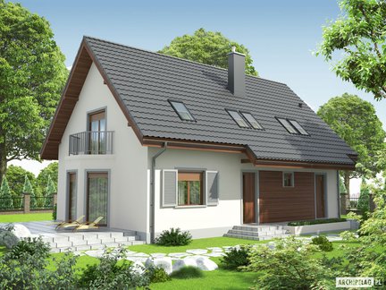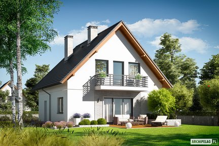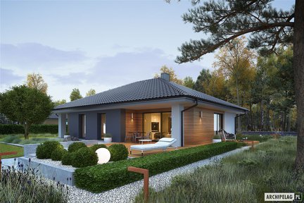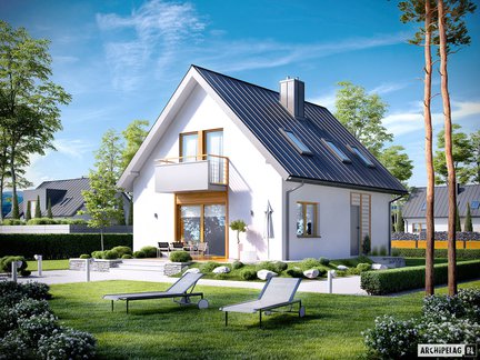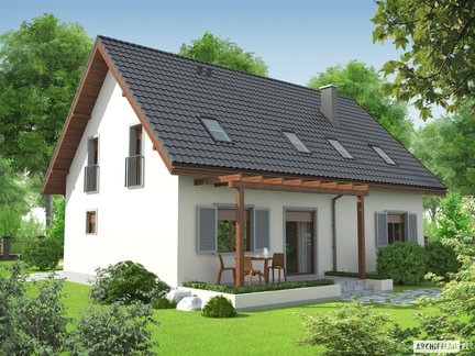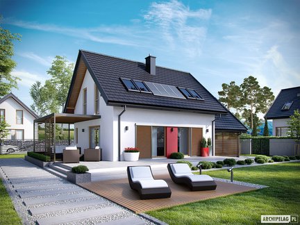 Niewielki, ale komfortowy i przytulny dom parterowy z poddaszem użytkowym o klasycznej bryle z dachem dwuspadowym. Wnętrze jest funkcjonalnie rozplanowane i znakomicie doświetlone, zapewniając domownikom komfort i pełną swobodę. Na szczególną uwagę zasługuje obszerny taras okalający dom z dwóch stron, częściowo zadaszony atrakcyjną pergolą – idealne miejsce na wypoczynek.