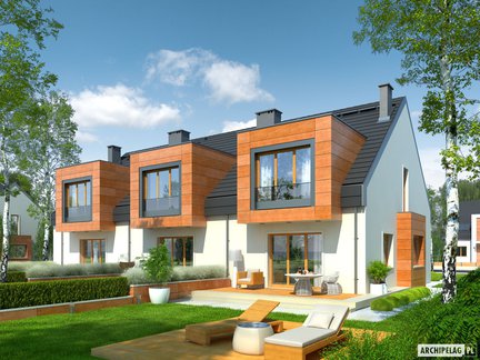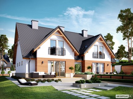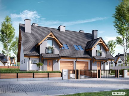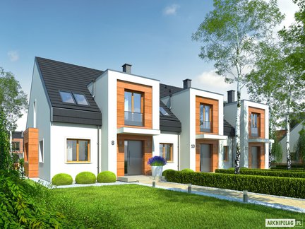 Projekt domu w zabudowie bliźniaczej z poddaszem użytkowym, z dachem dwuspadowym, którego klasyczną bryłę zdobią atrakcyjne lukarny. Uwagę przyciąga również nowoczesne wykończenie elewacji. Dom charakteryzuje się czytelnym i funkcjonalnym rozkładem pomieszczeń z podziałem na strefy pomiędzy kondygnacjami. Na uwagę zasługuje nastrojowy kominek w sercu strefy dziennej.