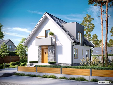 To projekt domu o prostej formie, nowoczesny i funkcjonalny. Uwagę przyciąga wykończone kamieniem wejście do domu, a bryłę dodatkowo wzbogacają atrakcyjne balkony. Wnętrze zostało funkcjonalnie rozplanowane, z dodatkowym gabinetem na parterze. Projekt tego domu pasuje na wąską działkę.