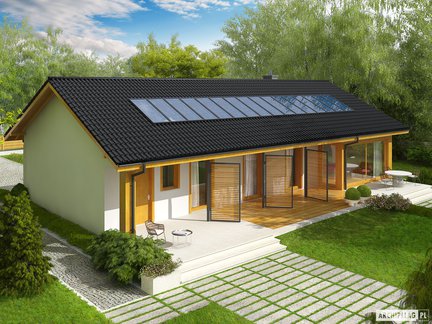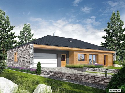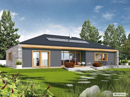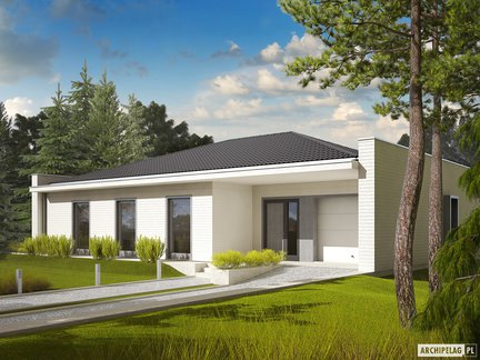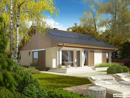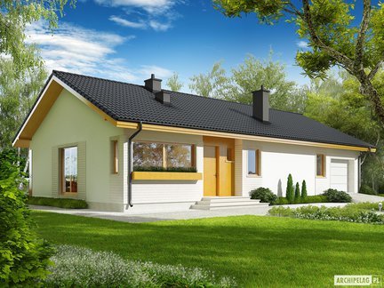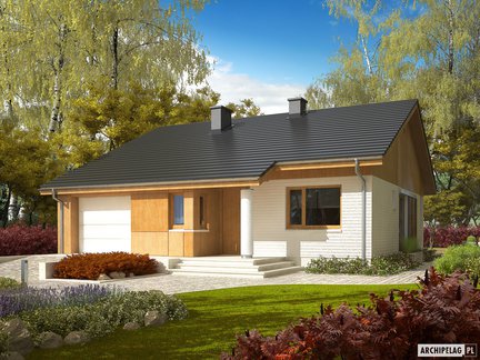 Projekt, który udowadnia, że mały dom może robić wielkie wrażenie. Oszczędny, nowoczesny, z ergonomicznie rozplanowanym wnętrzem zapewniającym komfort w codziennym użytkowaniu. Mimo niewielkiej powierzchni, wnętrze domu zaskakuje przestronnością i słonecznym charakterem. Na uwagę zasługuje salon z dużymi przeszkleniami. Garaż z częścią mieszkalną łączy duża i praktyczna kotłownia.