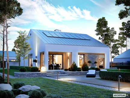 To przykład klasycznej, prostej bryły w nowoczesnym wydaniu. Szczególną uwagę zwraca piękna, elegancka biel na elewacji i ściany boczne wykończone okładziną kamienną i wysunięte powyżej linii okapu. Funkcjonalne wnętrze z wygodnym dostępem do wszystkich pomieszczeń zapewnia mieszkańcom intymność i komfort w codziennym użytkowaniu. Szerokie przeszklenia wspaniale doświetlają wnętrze, a dodatkową strefę relaksu tworzy zaciszny taras.