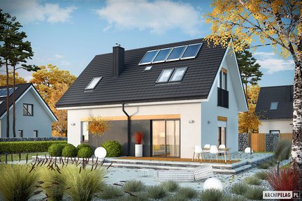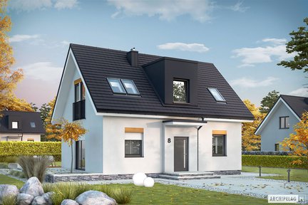 Projekt domu tani w realizacji, ekonomiczny w utrzymaniu i bardzo wygodny na co dzień, którego prosta bryła została wzbogacona atrakcyjną lukarną nad wejściem. Prezentuje się bardzo efektownie dzięki eleganckiej elewacji w ponadczasowej bieli z dodatkiem modnej szarości. Wspaniale doświetlone wnętrze posiada funkcjonalny rozkład pomieszczeń, z maksymalnym wykorzystaniem powierzchni, który zapewnia domownikom komfort użytkowania.