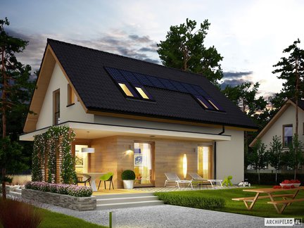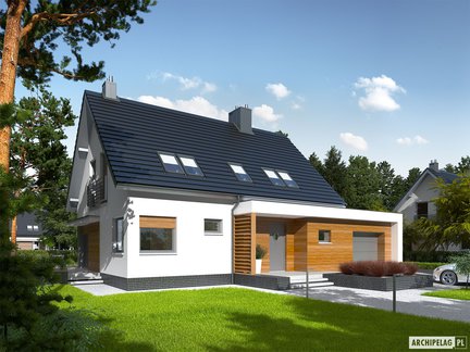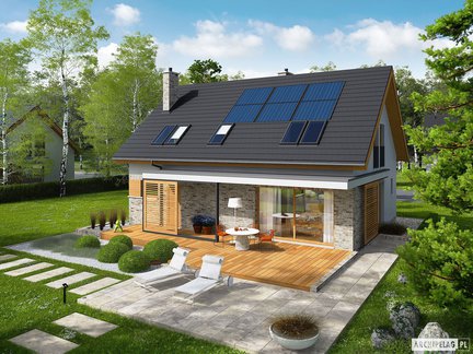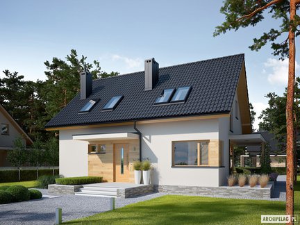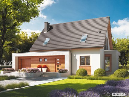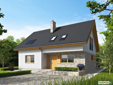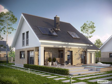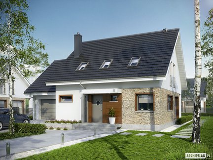 Nowoczesny i bardzo stylowy projekt domu przyciąga uwagę szykownym kamieniem na elewacji, który został podkreślony dodatkiem elementów drewnianych. Wejście do budynku zostało zaznaczone praktycznym zadaszeniem. Wnętrze podzielono na strefy pomiędzy kondygnacjami. W otwartej strefie dziennej komunikację wydzielono atrakcyjną ścianką. Poddasze skrywa trzy zaciszne sypialnie i łazienkę. Do wykorzystania jest również przestrzeń nad garażem, gdzie możemy zorganizować praktyczny strych.
