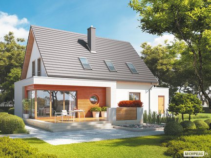 Projekt tego domu zwraca uwagę swoją nietuzinkową formą. Prosta, klasyczna bryła została wzbogacona o charakterystyczne zadaszenia nad strefą wejściową oraz tarasem i wykuszem. Elegancka elewacja została podkreślona dodatkiem drewna. Wnętrze jest funkcjonalne i wygodne, zapewniając domownikom komfortowe warunki do życia i odpoczynku. W salonie uwagę zwraca przeszklona, narożna ściana, która naturalnie otwiera dom na ogród.
