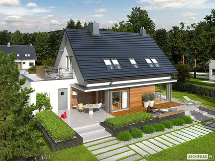 Atrakcyjny i nowoczesny dom z piękną elewacją utrzymaną w bieli z dodatkiem drewna i stolarki w modnym, szarym kolorze. Funkcjonalne wnętrze zapewnia maksimum komfortu wszystkim domownikom. Jest przy tym wspaniale doświetlone dzięki szerokim i licznym przeszkleniom. Na uwagę zasługują dodatkowe strefy relaksu – szeroki, częściowo zadaszony taras tuż przy strefie dziennej oraz kameralny taras nad garażem dostępny z sypialni głównej na poddaszu.