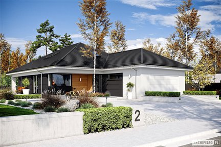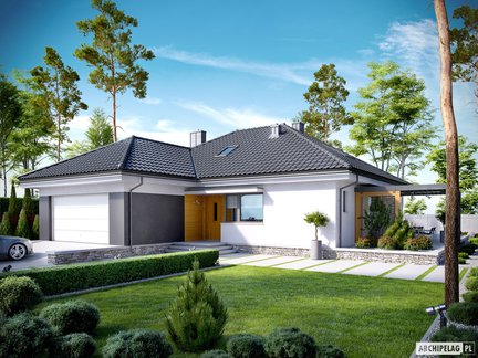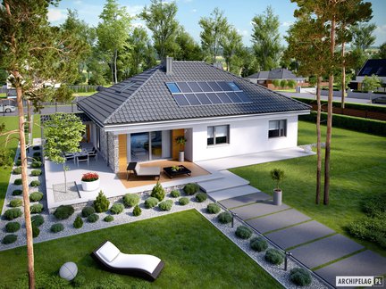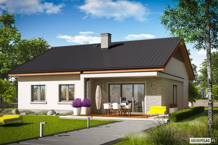 Ten projekt domu zaprojektowano z myślą o rodzinie, która chce mieszkać modnie i komfortowo. Energooszczędny i tani w ogrzewaniu dom parterowy jest znakomicie doświetlony dzięki dużym przeszkleniom. Przestronne i wygodne wnętrze zlokalizowane na jednym poziomie zostało funkcjonalnie podzielone na strefy. Przytulny taras z ciekawym zadaszeniem dostępny z sypialni i salonu zachęca do odpoczynku w otoczeniu własnego ogrodu.