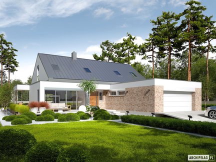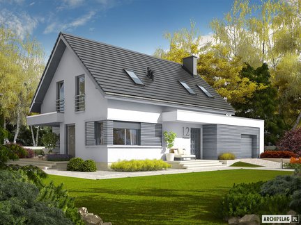 To nowoczesny projekt domu, który przyciąga uwagę modnym wykończeniem elewacji i dużymi przeszkleniami. Jest bardzo przestronny, jasny i słoneczny. Wnętrze zostało funkcjonalnie podzielone na strefy. Dodatkowa przestrzeń do odpoczynku to przytulny, zadaszony taras dostępny z salonu i głównej sypialni. Na uwagę zasługuje obszerne poddasze do adaptacji, które można zaaranżować w dowolny sposób i przeznaczyć np. na pokoje dla dzieci, sypialnie dla gości, dodatkowy gabinet czy pokój rekreacyjny.