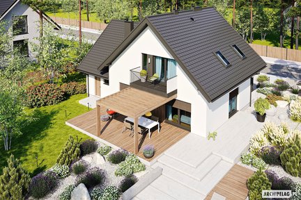 To projekt domu parterowego z poddaszem użytkowym o tradycyjnej bryle, z klasyczną i elegancką bielą na elewacji. Bardzo rodzinny i przytulny, z funkcjonalnym i nowoczesnym wnętrzem. Największym atutem domu jest jego taras – częściowo zadaszony efektowną pergolą, nad którą dodatkowo znajduje się kameralny balkon dostępny z głównej sypialni.