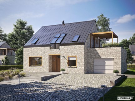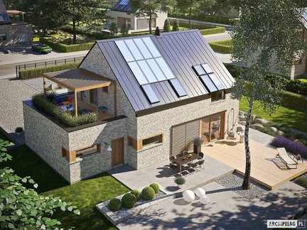 To projekt domu o prostej bryle, któremu uroku i elegancji dodaje elewacja – klinkierowa z elementami drewna oraz okna kolankowe, które doświetlają poddasze. Dom ten oszczędza dla swoich właścicieli, ponieważ zaprojektowano w nim energooszczędne instalacje: pompę ciepła, wentylację mechaniczną z rekuperacją i panele fotowoltaiczne. Taras na dachu garażu dostępny jest z korytarza na poddaszu, jego dodatkowym atutem jest atrakcyjna pergola, która daje przyjemny cień w upalne dni.