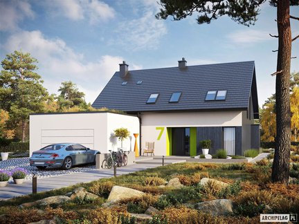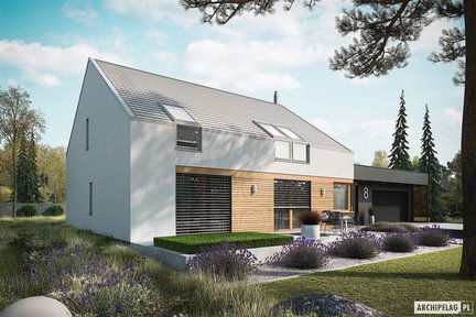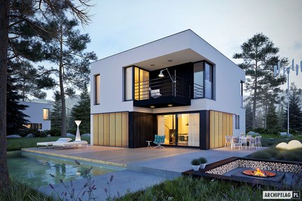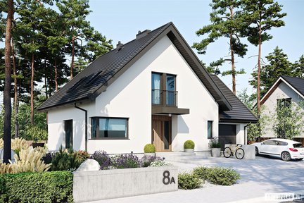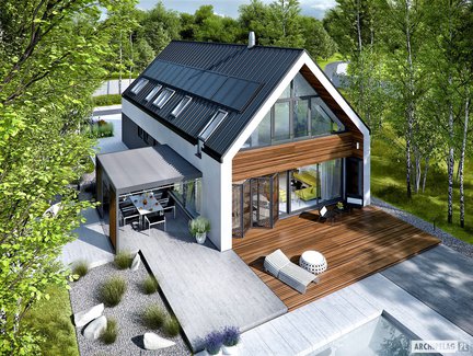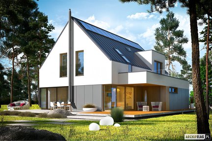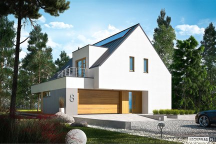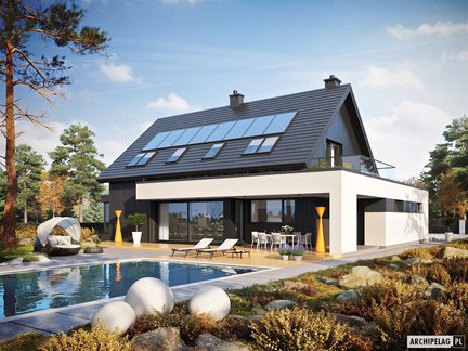 Ten niebanalny i nowoczesny projekt domu, który zachwyca swoja formą i dużymi przeszkleniami. Na uwagę zasługują dwa tarasy – jeden od strony ogrodu z atrakcyjnym zadaszeniem oraz drugi nad garażem dostępny z poddasza. Wnętrze jest bardzo przestronne i daje domownikom maksimum komfortu. Strefa nocna została wyraźnie oddzielona– trzy wygodne sypialnie znajdują się na poddaszu, natomiast sypialnia główna z własną łazienką i garderobą została zaprojektowana na parterze.