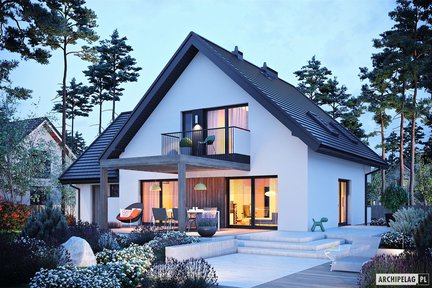To projekt domu z poddaszem użytkowym o tradycyjnej bryle, z klasyczną i elegancką bielą na elewacji. Bardzo rodzinny i przytulny dom z funkcjonalnym oraz nowoczesnym wnętrzem czytelnie podzielonym na strefy użytkowe. Pomysłowo wykorzystano także przestrzeń nad garażem, planując tutaj praktyczny strych. Jedną z najatrakcyjniejszych części domu jest jego taras – częściowo zadaszony dekoracyjną pergolą, nad którą dodatkowo znajduje się kameralny balkon dostępny z głównej sypialni.