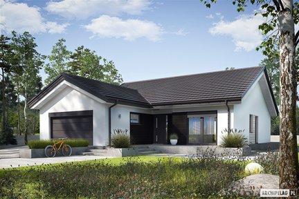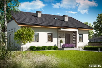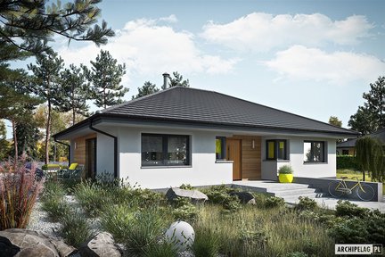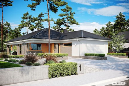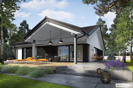Wyjątkowy projekt domu parterowego, który zwraca uwagę eleganckim wykończeniem elewacji i obszernym tarasem z atrakcyjnym zadaszeniem. Przestronne wnętrze cieszy domowników codzienną wygodą i funkcjonalnością. W prywatnej części domowników znalazły się aż cztery wygodne sypialnie i dwie łazienki. Strefa dzienna to otwarta przestrzeń, wspaniale doświetlona dzięki dużym przeszkleniom, które harmonijnie łączą salon z tarasem i ogrodem.