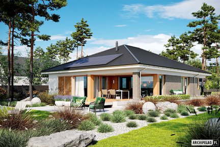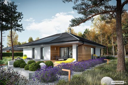 Jest to nowoczesny, przytulny i energooszczędny projekt domu parterowego, który spełnia wszystkie oczekiwania współczesnej rodziny. Jego zwarta bryła z pięknie wykończoną elewacją kryje w sobie przestronne, optymalnie doświetlone wnętrze, a zadaszony taras płynnie łączy salon z ogrodem. Dom w standardzie posiada energooszczędne instalacje: pompę ciepła, wentylację mechaniczną z rekuperacją i panele fotowoltaiczne.