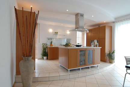 Oprócz standardowych rodzajów zabudowy można zastosować układ wyspowy (szafki umieszczone pośrodku pomieszczenia tworzą wyspę dostępną z czterech stron lub półwysep - dostępny z trzech stron).